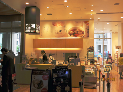 当店には本物の鰹だしのおいしさを知っていただくとともに“一汁三菜”という健康バランスのよい日本古来の食事の良さを多くの人に伝えていきたいとのことで、店内に「日本橋だし場」を設けており、だし汁が100円、つゆ物、おでんだし、ふりかけご飯と食するコーナーがあり、なかなかの人気です。
