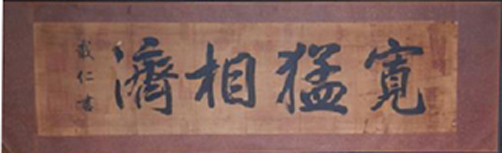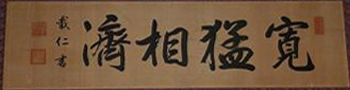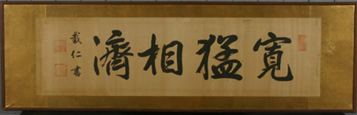 兄の家の「寛猛相濟」は、戦前父が勤めていた学校の講堂に有ったもので終戦の時校旗や書類等を焼却した。そのとき持ち帰ったものである。戦後落ち着いてから表装し客間に飾った。因に父は「アメリカの教育はできない」と教員は辞め木工場の親父になった。