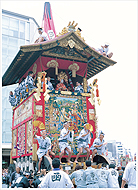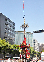 「鉾」 は、車輪の直径が1.9メートルもあって、巡行時の重量は8.5-12トン、高さが地上から屋根まで8メートル、鉾頭まで25メートルで、囃子舞台に 40-50人もの囃子方が乗り込んで、巡行に当たって綱を曳く“曳子”役が40-50人を擁するという巨体ぶり。「山」の方も、重量0.5-1トンで“舁 方”が14-24人必要だそうです。