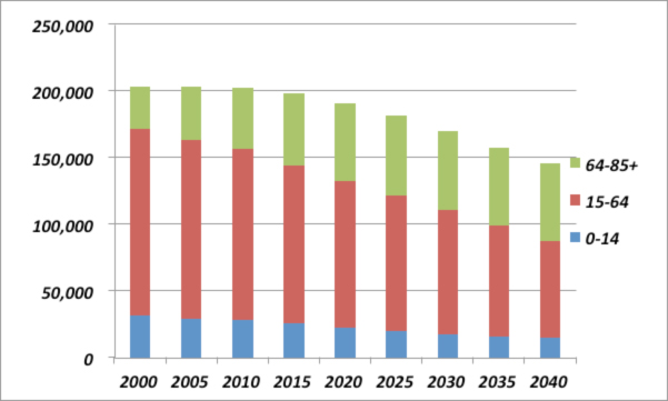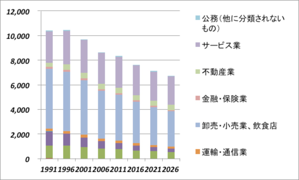1996年には10,445あった企業数が、2006年には8,634まで減った。2026年には6,700くらいまで減ると予想される。然し、このシミュレーションによれば、2026年で雇用する人数は84,000人程度となる。一方、人口統計から予想される2026年の労働人口は55,000人程度であるから、そのギャップを埋めるために、もっと早く企業数が減少するのであろう。
