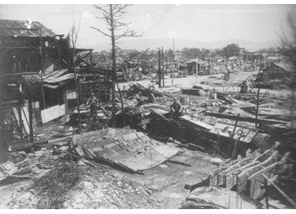 | 一方、大型機B29による日本本土空襲は、1944年11月から敗戦までの9ヶ月間絶え間なく続けられ、地方都市を含めた約120都市が大きな被害を受けたのですが、小田原はB29による空襲候補地「180都市リスト」の96番目であったため、“計画的な”小田原への空襲が行われる前に敗戦になったのだそうです。しかし、終戦の日(8月15日)の前日に埼玉県の伊勢崎と熊谷を空襲したB29のうちの1機が帰路に浜町と本町に焼夷弾を投下したために小田原市は被災し、400件近い家屋の全焼12名の死者を出すことになってしまいました。右の写真は“最後の空襲”の数少ない証拠写真とされるものですが、焼け落ちた古清水旅館の後方に被災した市街地が見えます。私にも小田原上空が赤く染まって見えたかすかな記憶が残っています。 |
