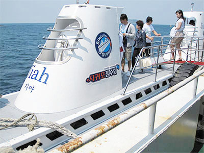 済州島第二日目は前日に見ておいた潜水艇による海底観光から始めた。潜水艇乗り場に行くと、結構な数の観光客が集まっていた。潜水艇は船着き場から直接乗れるのではなく、連絡船で少し沖に出てから潜水艇に乗り移るのである。皆先を争って連絡船にのり込み、沖へ向かうと島が見えてきた。この島の周辺で潜水するのだそうだ。