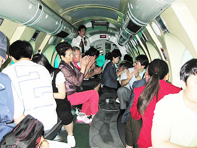 潜水艇は、連絡船が止まるとゆっくりと近づいてきて接舷した。船体長10メートル程度で細く、白い船体は華奢に見えた。艇の前部と後部にはハッチカバーの塔が立っている。艇内に入ると中央通路を挟んで両側に席がある。席にはそれぞれ丸窓があって、外を覗ける仕組みだ。