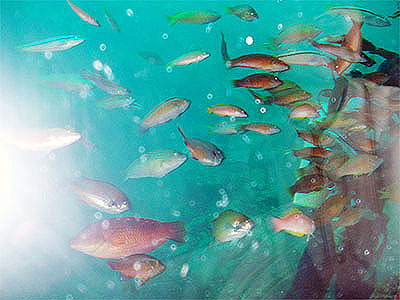 はじめに船員から安全注意とこれからの行く先について説明があった。なにぶん韓国語だから内容は皆目分からない。やがて艇は垂直に潜水を始め、数メートル潜ったところでコトコト走り始めた。島の岸壁に沿って進むので、ゆっくり進んでいるのがわかる。この間も船員がいろいろ説明するが、皆目分からない。艇は数十メートル進んだかと思ったところで停止し、やがて艇外に潜水士が現れ餌を撒きはじめた。集まってくる魚は大小さまざまだが、窓ガラスが厚くてレンズ場のため実際の大きさはよく分からない。この程度なら水族館で魚を見る方が迫力がある、というのが正直な感想であった。 |