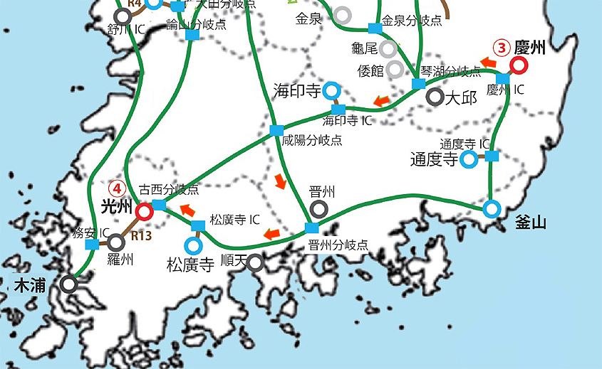 第4日は慶州(Gyeongju)を発って大邸(Daegu)、海印寺(Haeinsa)、と9号路を東から西へ進み、咸陽(Xianyang)分岐路で南へ下って南海高速国道へ入り、そこから西へ向かって松廣寺(Songwansa)へ寄ってから光州(Kwangju)に向かう計画である。海印寺は高麗(Golyeo)八萬大蔵経(Palman daejang gyeongng)を蔵していることで有名で、世界遺産に指定されている。