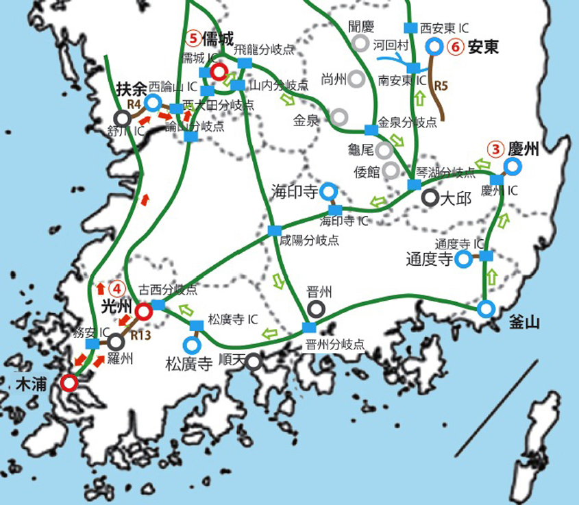 第5日は光州を発って木浦(Mokpo)へ、そして百済(Paekche)が首都を置いていた扶余(Buyeo)を経由して儒城(Yuseong)へ向かう。光州は1980年に全斗煥大統領の軍部政治に反対する民主化運動が拡大し、ついには武器庫を襲った市民が軍と銃撃戦を行うに至ったいわゆる「光州事件」で有名である。しかし、市内には見るほどのものはないため、一路木浦へ向かった。木浦は朝鮮半島の南西角に位置していて、西側の黄海に向かって開けた港町である。港の入り口には無数の島が点在し、波浪をふせぐ天然の良港となっている。