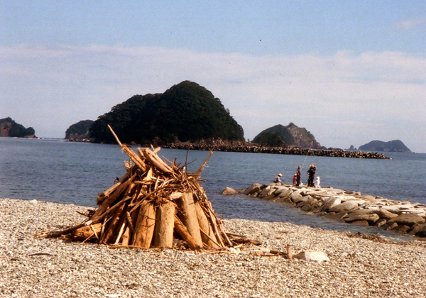 古里海岸を抜けると道瀬海岸――大小の島々が浮かび、紀伊松島と呼ばれる美しい海岸には、8月末に熊野地方を襲った集中豪雨の名残りか、打ち上げられた流木がいくつか矢倉状に組まれている。