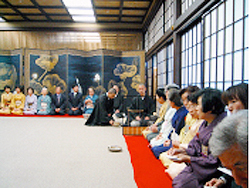 お寺の供茶式は僧侶の護摩焚きと読経が流れる中、家元が仏様へ供茶する儀式に参列し、添釜の三席(濃茶・薄茶・立礼)で仏様の相伴の一服をいただくのが決まりである。
